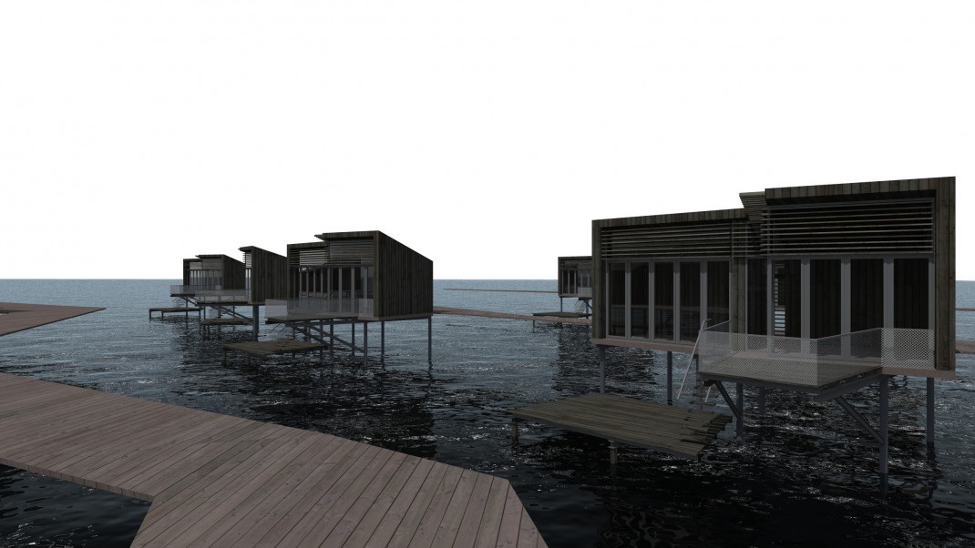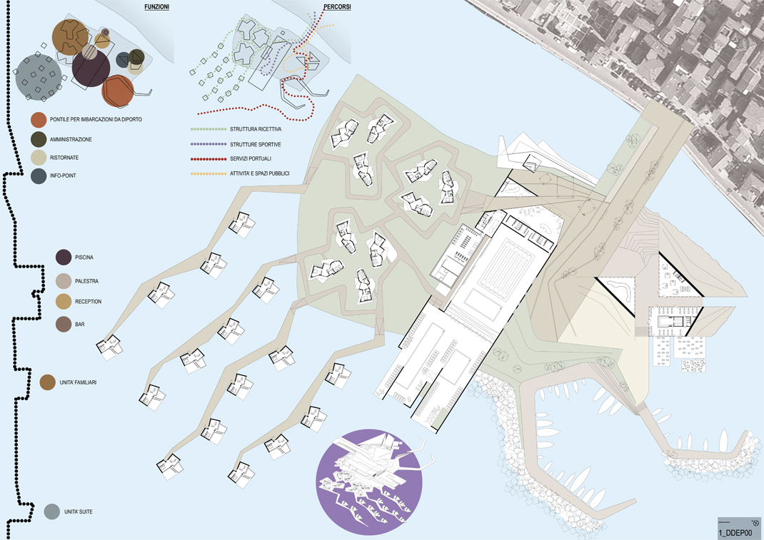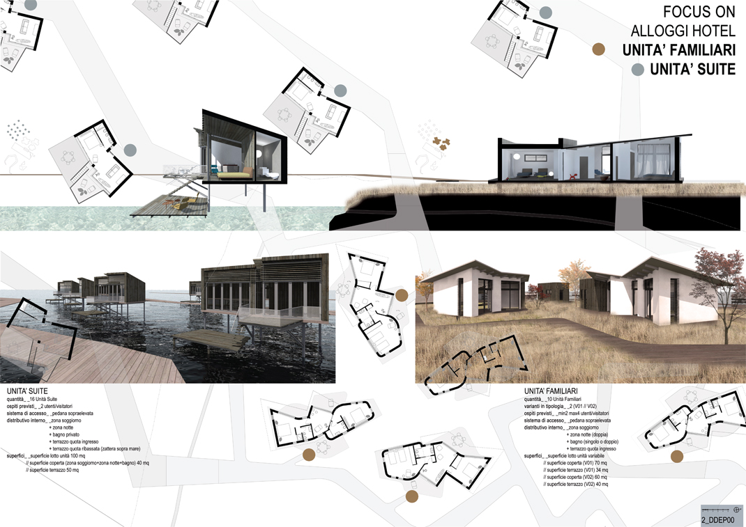 L’idea progettuale parte dalla volontà di definire un nuovo collegamento tra l’isola del Buon Castello e la penisola di Sottomarina, così da facilitarne il raggiungimento e connettere le funzioni richieste dal bando di concorso con il tessuto urbano. La risposta progettuale risolve tale obiettivo proponendo una piastra pedonale che parte dalla sponda di Sottomarina e collega l’isola del Buon Castello. La piastra s’inserisce in planimetria aprendo un corridoio avente direzione Est-Ovest. La superficie di questo componente urbano si articola in percorsi sagomati, aventi funzioni e superfici differenti che consentono di definire un nuovo spazio utile ai futuri utenti dell’isola. Nella sezione della pedana trova spazio un’aiuola verde, una rampa per skate-board e pattini, un’area pavimentata in legno, elementi di illuminazione, alberature e piante. La piastra, attraversa l’isola mimetizzandosi con la pavimentazione e conduce gli utenti verso la piazza centrale. Tutti gli spazi che si generano diventano un luogo adatto per il mercato, manifestazioni locali e per eventi all’aria aperta. La piastra ha il compito di condurre all’area pubblica dell’isola consentendo l’accesso all’edificio polisportivo, alla reception del residence ed al centro servizi per i residenti e visitatori. Dalla piazza e dalla zona servizi, procedendo in direzione sud, i percorsi conducono ad un porto turistico con due moli che proteggono lo spazio di sosta dei natanti e che guarda la costa in direzione Chioggia. Il progetto prevede che le funzioni “pubbliche” previste dal bando siano accessibili da due percorsi, ai quali corrispondono le uniche due porte di accesso all’isola: la porta est, corrisponde alla pedana che arriva dalla penisola di Sottomarina (percorso pedonale / carrabile leggero); la porta sud-ovest è definita dal porto turistico (utenti che arrivano con le barche dal mare). Le porte urbane che scandiscono gli ingressi definiscono conseguentemente la distribuzione in planimetria delle due macro categorie individuate nell’abito di progetto: CATEGORIA PUBBLICA (centro polisportivo – bar – ristorante – amministrazione – area servizi) e la CATEGORIA PRIVATA (struttura ricettiva, definita privata poiché caratterizzata da un uso esclusivo da parte dell’utenza). Tale distribuzione prevede che la categoria pubblica occupi la porzione sud dell’isola mentre la categoria privata si estende nella zona nord. L’edificio polisportivo si conforma in un volume parallelo alla piastra e che divide l’isola un due zone virtuali. Il prospetto che guarda Chioggia si affaccia sulle vasche all’aperto, quello verso Sottomarina si apre su una zona aperta attrezzata su cui è collocato il bar a servizio degli utenti l’isola. L’area servizi si colloca di fronte alla piscina, sul lato opposto della piazza, in questa zona, le destinazioni d’uso occupano tre blocchi distinti, che imitano tre lembi/scogli che salgono del mare. L’area ricettiva che occupa la zona a nord dell’isola, e che guarda verso Sottomarina nord e il Forte San Felice, rafforza il rapporto con l’acqua e con il territorio. In questa zona le due tipologie di alloggi, si conformano per interagire in modo specifico con l’acqua e la terra. Si relaziona principalmente con la TERRA la tipologia per famiglie composta da una zona giorno e di ampi balconi esterni per favorire la vita all’aria aperta, parallelamente interagisce con l’ACQUA l’ “alloggio suite” posizionato sul mare è progettato prendendo come riferimento la tipologia architettonica dei “casoni” della laguna. Entrambe le tipologie sono sollevate dalla quota del terreno e si raggiungono tramite percorsi che non invadono il contesto in cui sono collocati. Questa scelta nasce dalla volontà di non intaccare la natura dell’isola, di lasciare inalterato il terreno su cui si insediano gli edifici residence. Questo è il modo con cui il progetto risolve la propria proposta di eco-turismo. Il progetto si inserisce senza copiare il tessuto esistente volontariamente, evitando di entrare in conflitto con la tipologia urbanistica conformata nel tempo da specifiche esigenze territoriali. Il rapporto con l’acqua e il territorio è la linea guida di tutto l’intervento; l’area servizi si genera dall’acqua, il centro sportivo la domina, il residence la osserva e la rispetta vivendoci all’interno.