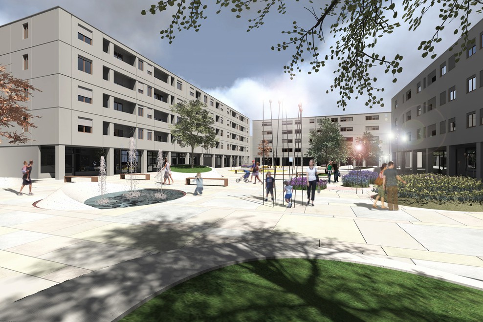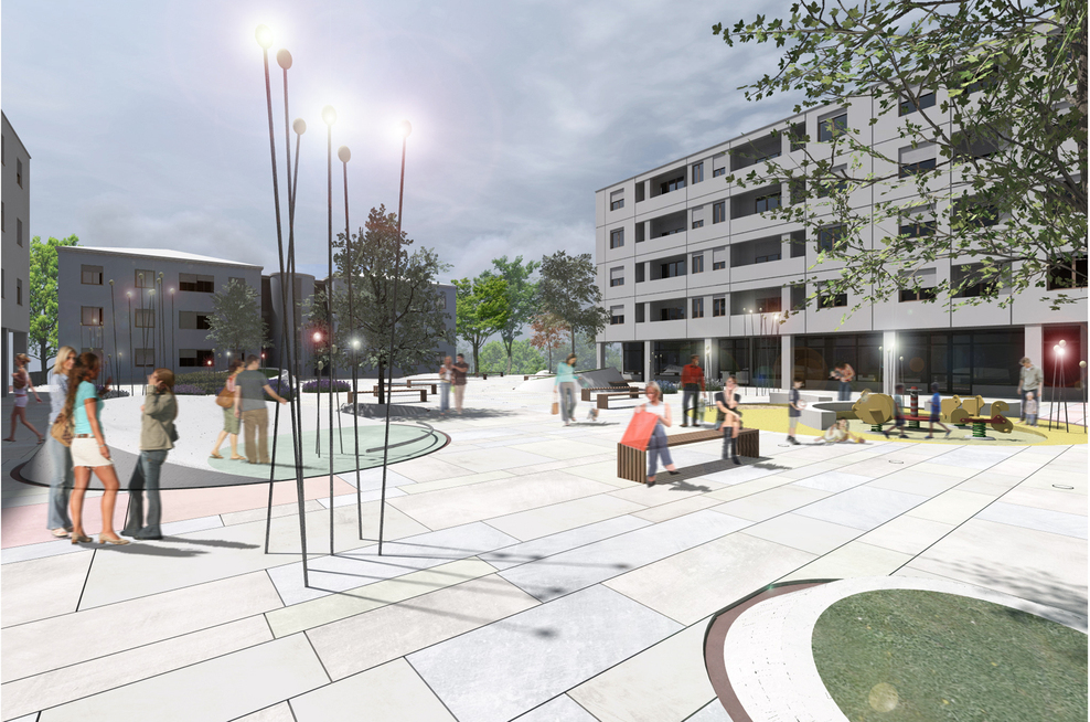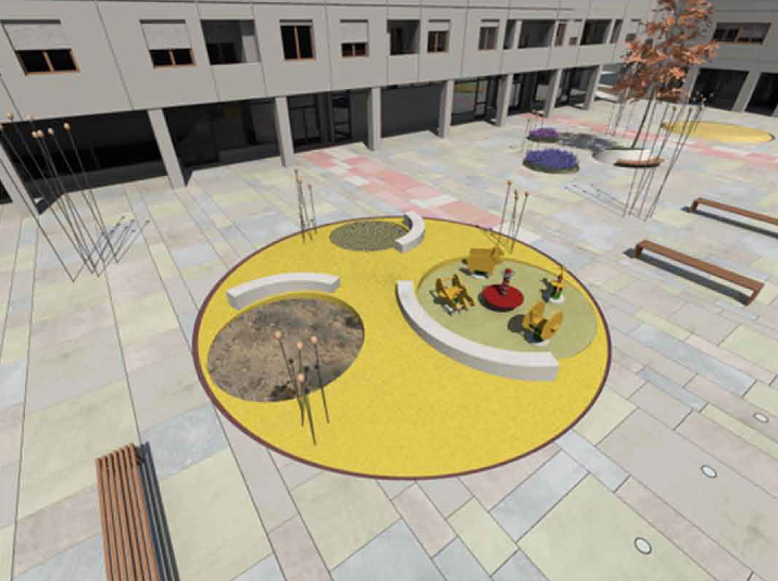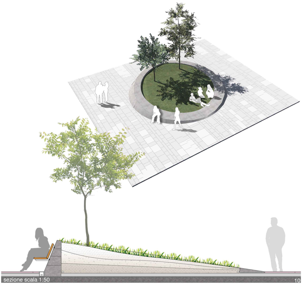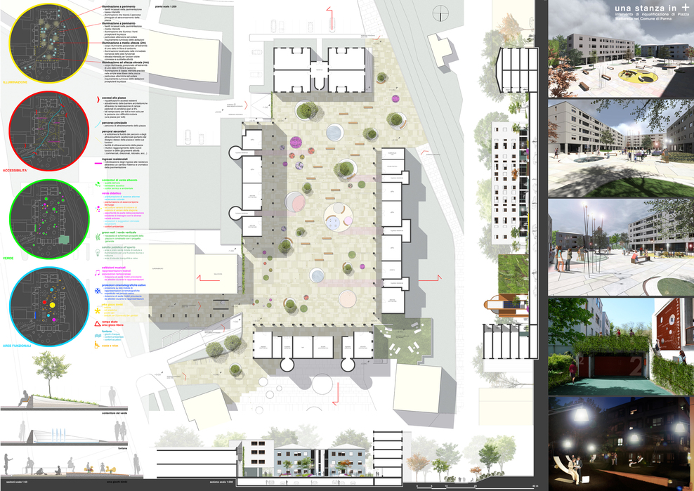 A due passi dal centro storico, Piazza Mattarella vive una posizione urbana privilegiata. Il quartiere infatti gode di una rara tranquillità dovuta anche alla presenza di una buona quantità di verde pubblico attrezzato. Questo però presenta alcuni elementi critici tra i quali la disconnessione degli ambiti verdi e la loro difficile accessibilità. L’intento progettuale propone la realizzazione di uno spazio perfettamente integrato con il tessuto esistente diventando pertanto modello esportabile agli ambiti urbani limitrofi e cittadini. La nuova piazza si configura dunque come un autentico “contenitore” funzionale capace di una metamorfosi continua, rapida e semplice in modo tale da ospitare attività ed eventi di ogni genere. La completa riorganizzazione dell’assetto funzionale ed il ridisegno della piazza consentono di trovare soluzioni progettuali che tendono ad un miglioramento estetico, pur mantenendone evidenti i caratteri principali, come l’accentuata geometria ortogonale disegnata dagli edifici prospicienti e dalla scansione regolare dei loro fronti principali. In questo progetto viene infatti posta l’attenzione su un carattere ora assente, ovvero quello di luogo urbano socialmente attivo ove la popolazione residente (e non) possa incontrarsi, dialogare, socializzare, aggregarsi, interagire con i nuovi elementi, sentendosi protetta in un luogo sicuro dall’elevato potenziale qualitativo. Il risultato è quindi un luogo attrattivo, funzionalmente diversificato dove l’aggregazione sociale viene incentivata da una nuova immagine di alta qualità urbana ed architettonica, caratterizzata dalla coesistenza dell’elemento naturale (verde, acqua, …) e quello edificato rappresentato dalle residenze e dalle attività commerciali legate alla piazza. Il progetto di “stanza pubblica all’aperto” consiste dunque nel dare ai residenti una “STANZA IN +” quale luogo generatore di benessere sociale. Al giorno d’oggi l’abitazione è vista sempre più come un luogo dove rifugiarsi e isolarsi. Si vogliono dare così quelle possibilità che negli anni sono state negate alla popolazione, usufruendo non solo del bene casa, ma anche e soprattutto del bene pubblico. Con questa nuova “stanza pubblica” si promuove il ritorno all’incontro, al gioco, al rafforzamento di scambi e relazioni tra la cittadinanza, incoraggiando pertanto il senso di appartenenza al luogo ed al proprio territorio. Il disegno organico rappresentato dalla distribuzione dei “contenitori” nasce dalla necessità di portare il verde all’interno della piazza, creando così un legame con gli ambiti limitrofi. Essendo questa collocata sopra un parcheggio seminterrato, le forme circolari a tronco di cono in c.a.p., fungono da contenitori di terra per la piantumazione delle differenti specie arboree, floreali ed arbustive. Da qui l’idea di riproporre il modello quale contenitore di funzioni varie. Vengono così installati contenitori di elementi naturali (verde, acqua, etc…) per il riposo, lo svago ed il relax; contenitori per attività ludico-ricreative legate al gioco; contenitori flessibili per eventi temporanei quali installazioni di giovani artisti locali, piccoli concerti musicali, rappresentazioni teatrali, etc. L’arredo urbano non è più un insieme di oggetti isolati, ma un sistema organico con il quale il cittadino si relaziona interagendo attivamente, fisicamente, intellettualmente, arredando liberamente lo spazio, dialogando con la natura attraverso la gestione delle differenti essenze arboree a livello di quartiere ed a uso domestico. La pavimentazione, realizzata principalmente in pietra di luserna in continuità con le pavimentazioni cittadine, accoglie le restanti aree libere flessibili quali luoghi di sosta e riposo, relazione, lavoro, studio, attività locali come mostre, sagre di quartiere, cinema all’aperto, manifestazioni estive di vario genere. La forma organica del progetto, capace di dialogare e reggere il confronto con il rigido impianto esistente, potrebbe diventare modello esportabile nelle similari realtà ad esso adiacenti. Tale opportunità consente di “ricucire” questi spazi, rendendoli parte di un sistema omogeneo di percorsi e funzioni, quale immagine di rinascita, qualità ed eccellenza urbana riconoscibile nell’ambito di riqualificazione degli spazi pubblici della Città di Parma.